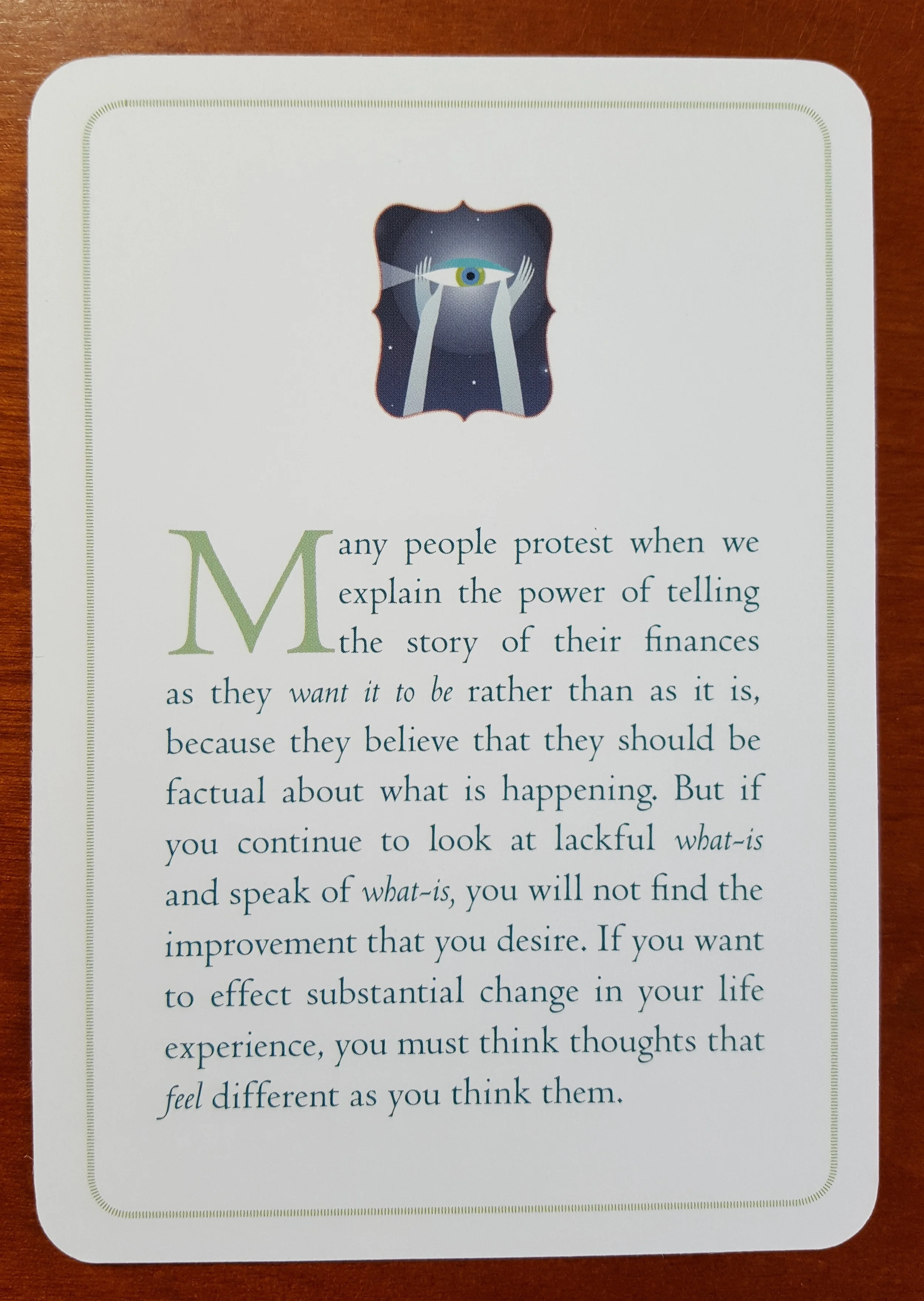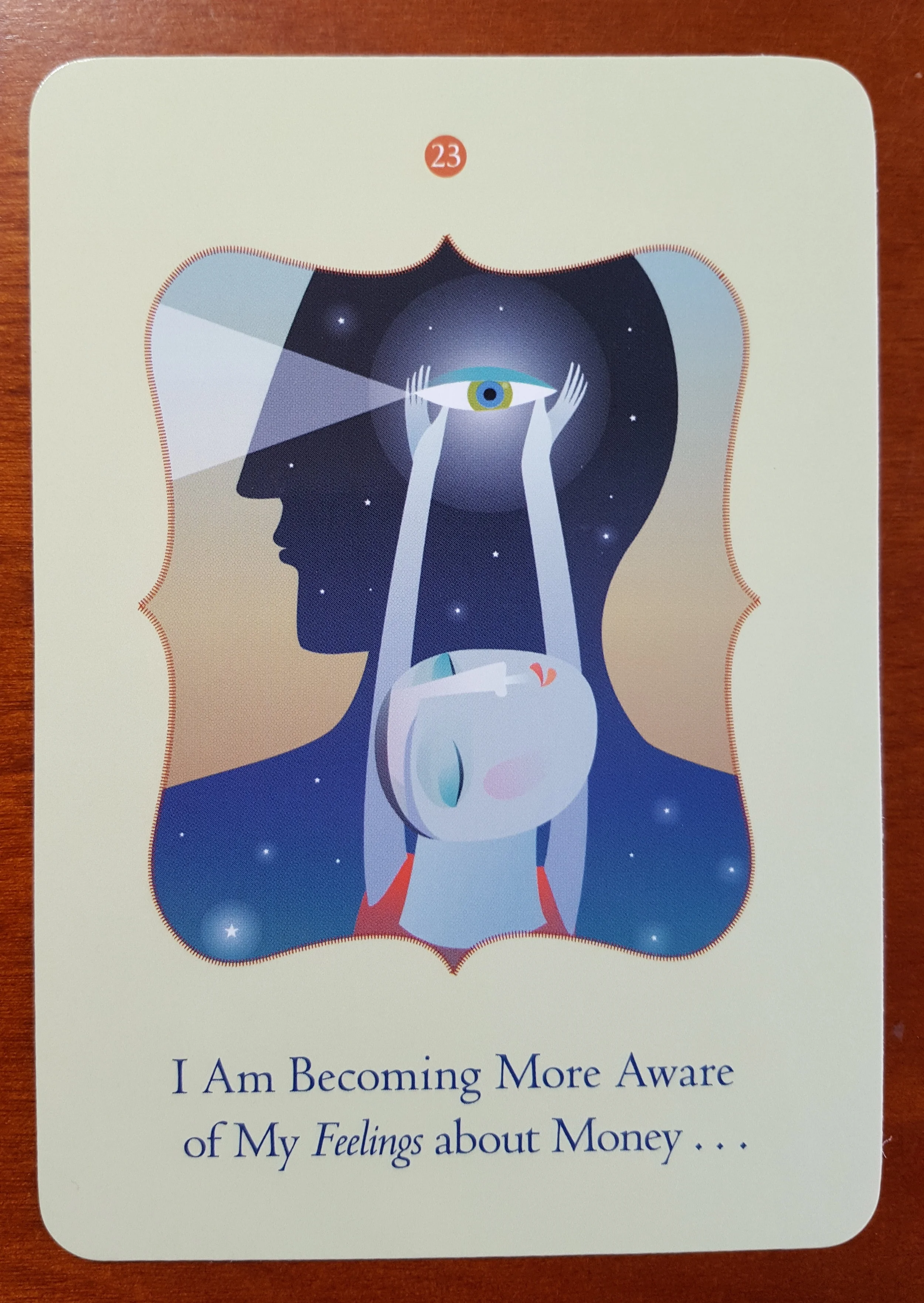 And so I offer this card from the “Money, and the Law of Attraction” card deck by Esther and Jerry Hicks. We all need to first become aware of how we feel about Money and then change any negative feelings or thoughts to ones that are positive and abundant. This is the first important step in changing our relationship with money from one of ambiguity, anxiety and overwhelm to one of love and fulfillment.